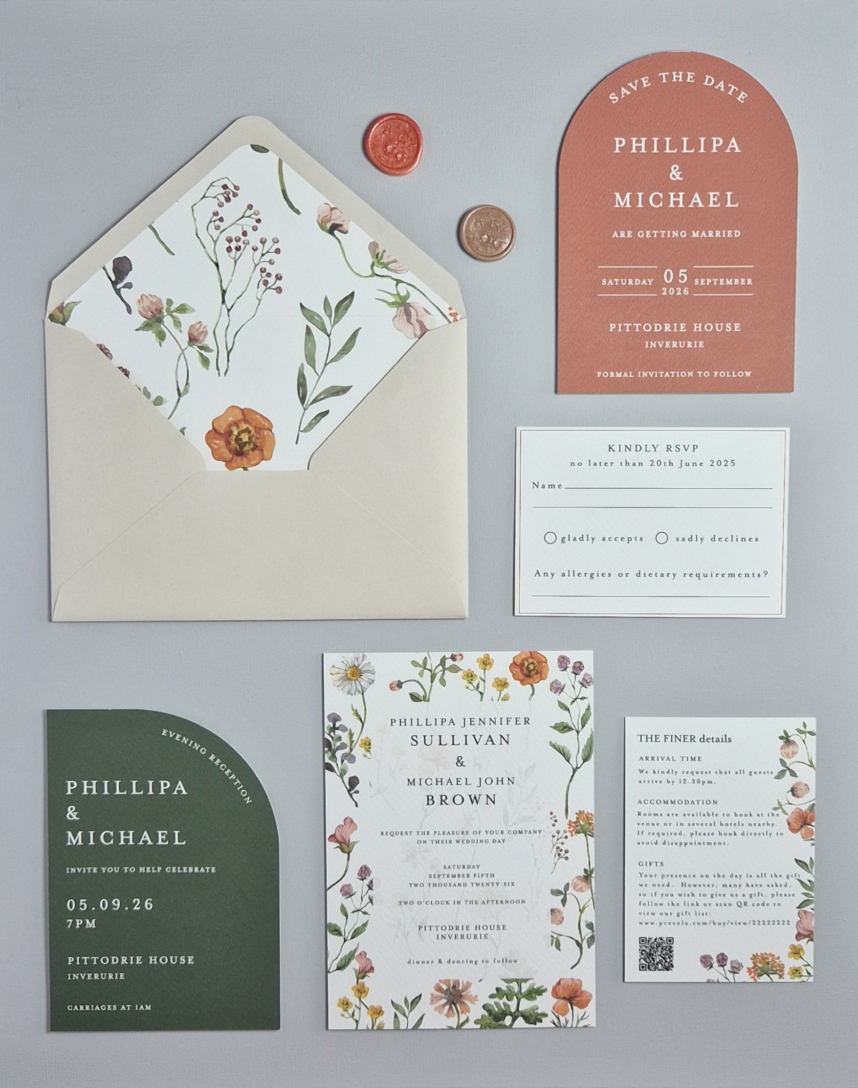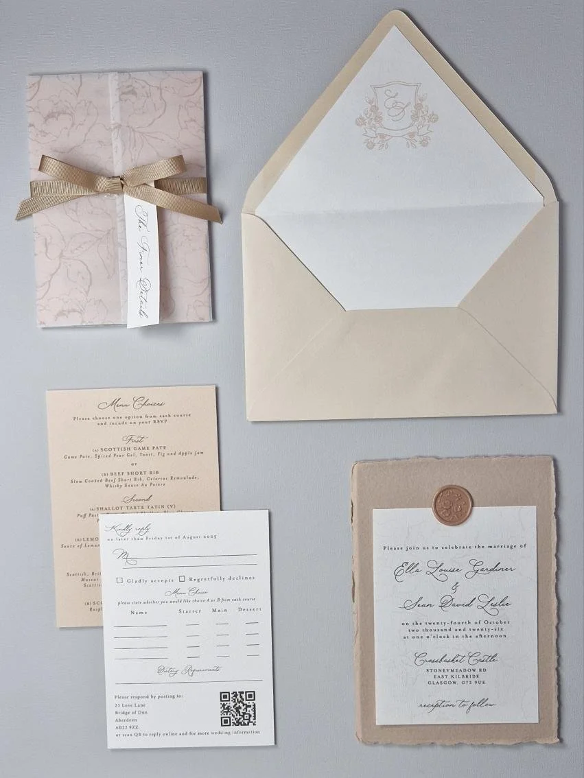 Visit the consultation page and book a free 30 minutes video chat or phone call to discuss what you are looking for. We will go over options, card stock, finishes and embellishments. It would be useful if you could send me any Pinterest pages or inspiration photos prior to our chat.
